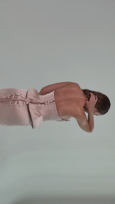 Crafted from dense yet supple satin with a subtle luminous sheen, the fabric gently sculpts the body while maintaining its structure. It drapes effortlessly, balancing softness with architectural precision.