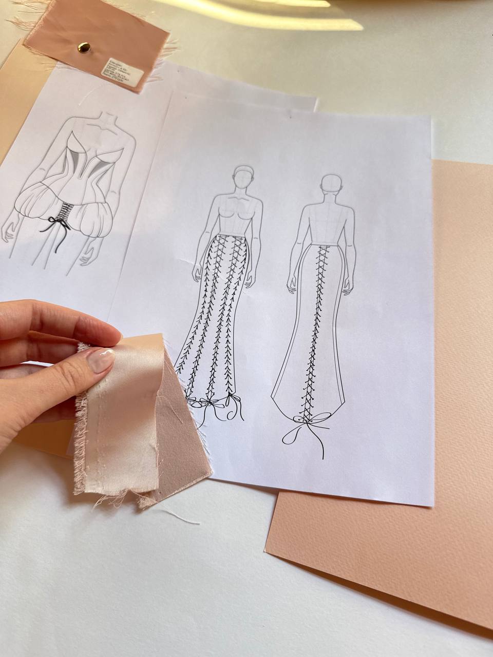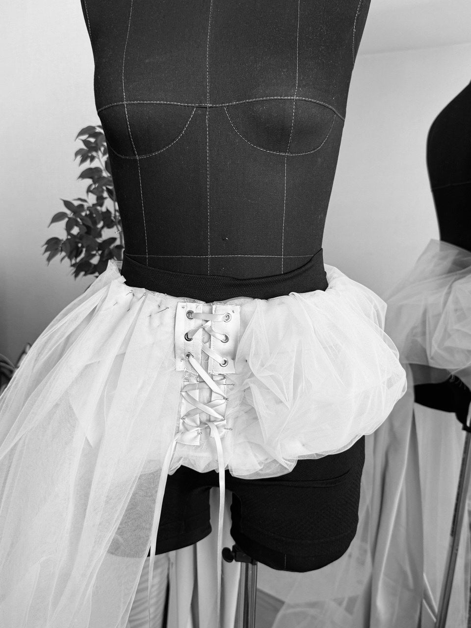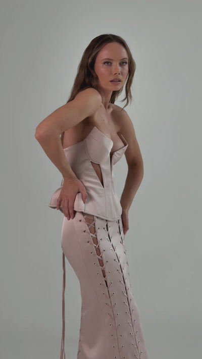 The corset is the centerpiece: high, accentuated waist, combining support with elegance.