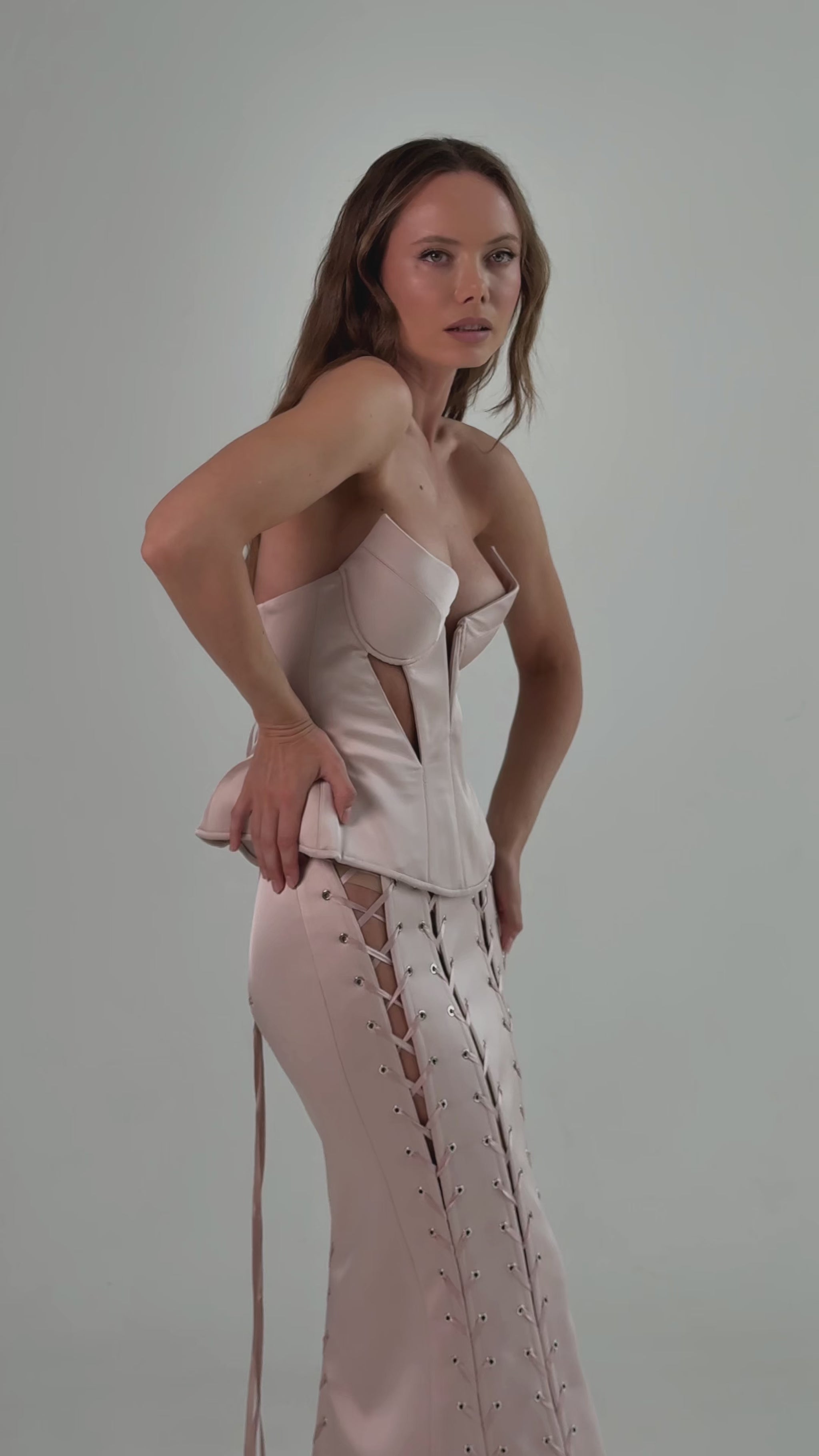 The Oriana corset is crafted from dense yet soft satin with a delicate sheen that catches the light. Its beige-peach shade complements any skin tone.