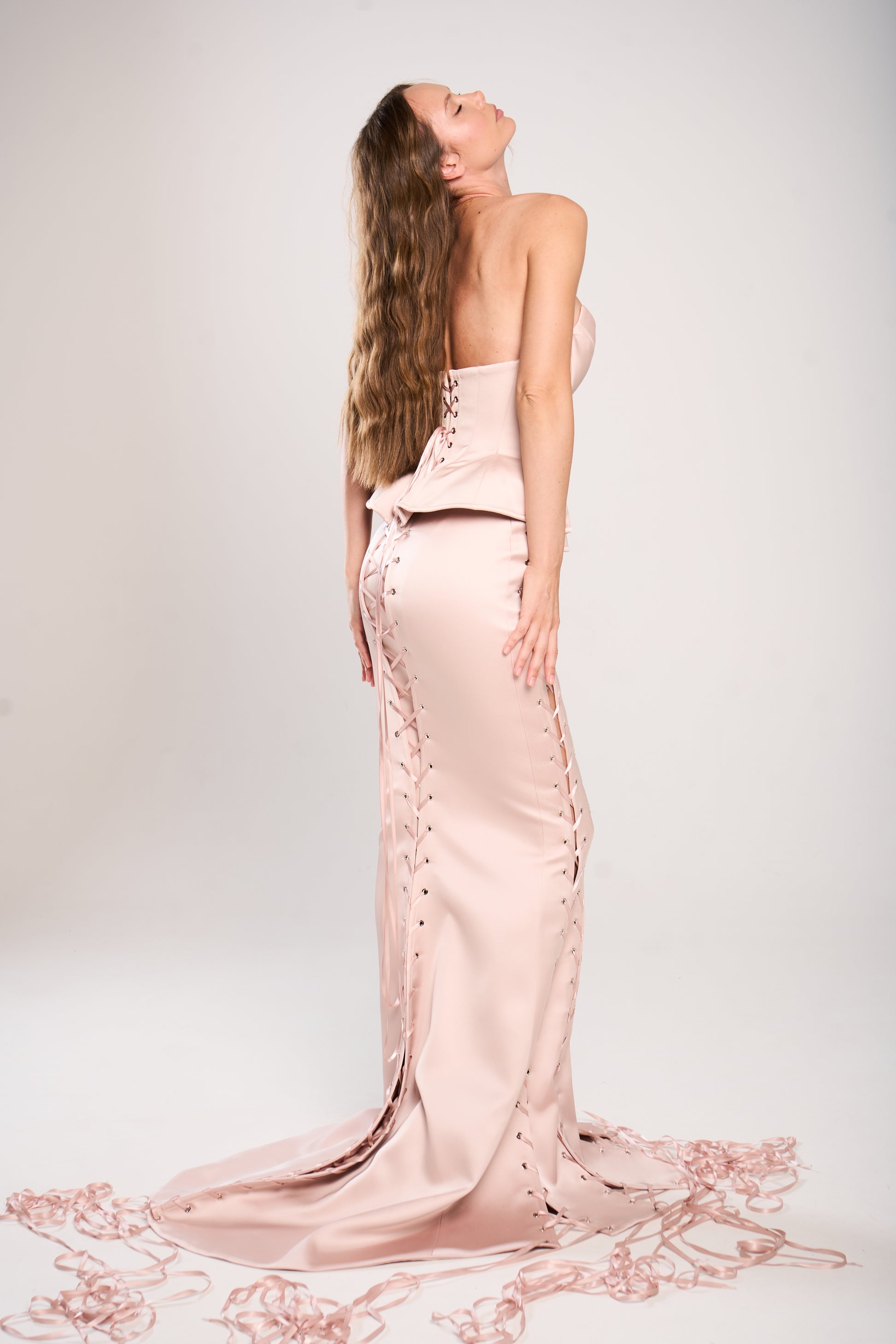 This floor-length skirt features five daring slits and elegant lacing, creating a fluid, dynamic silhouette with a dramatic train.