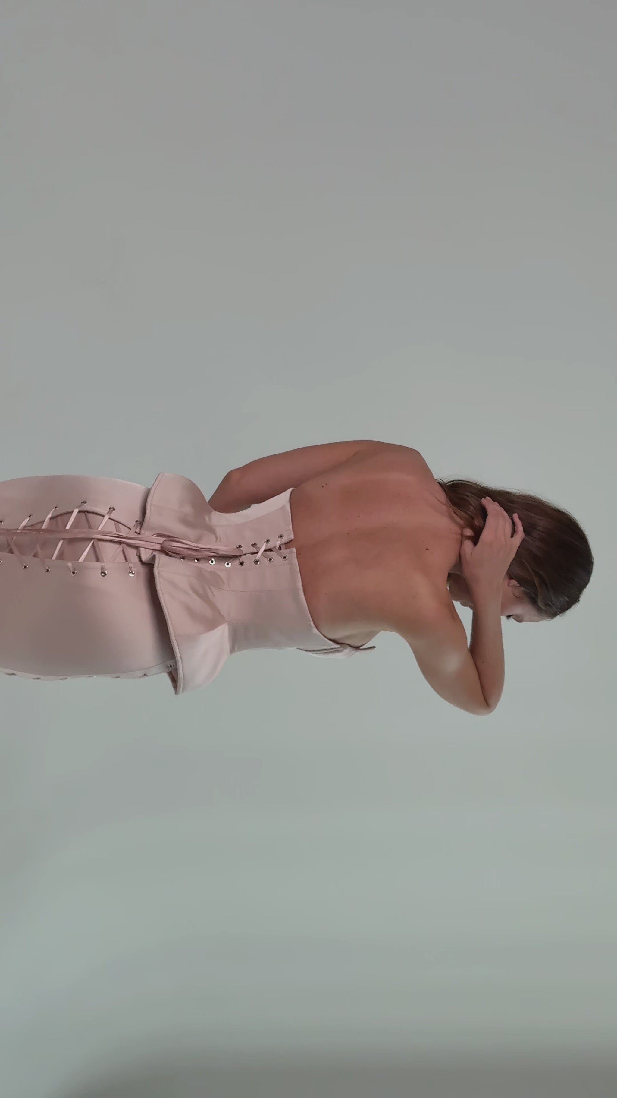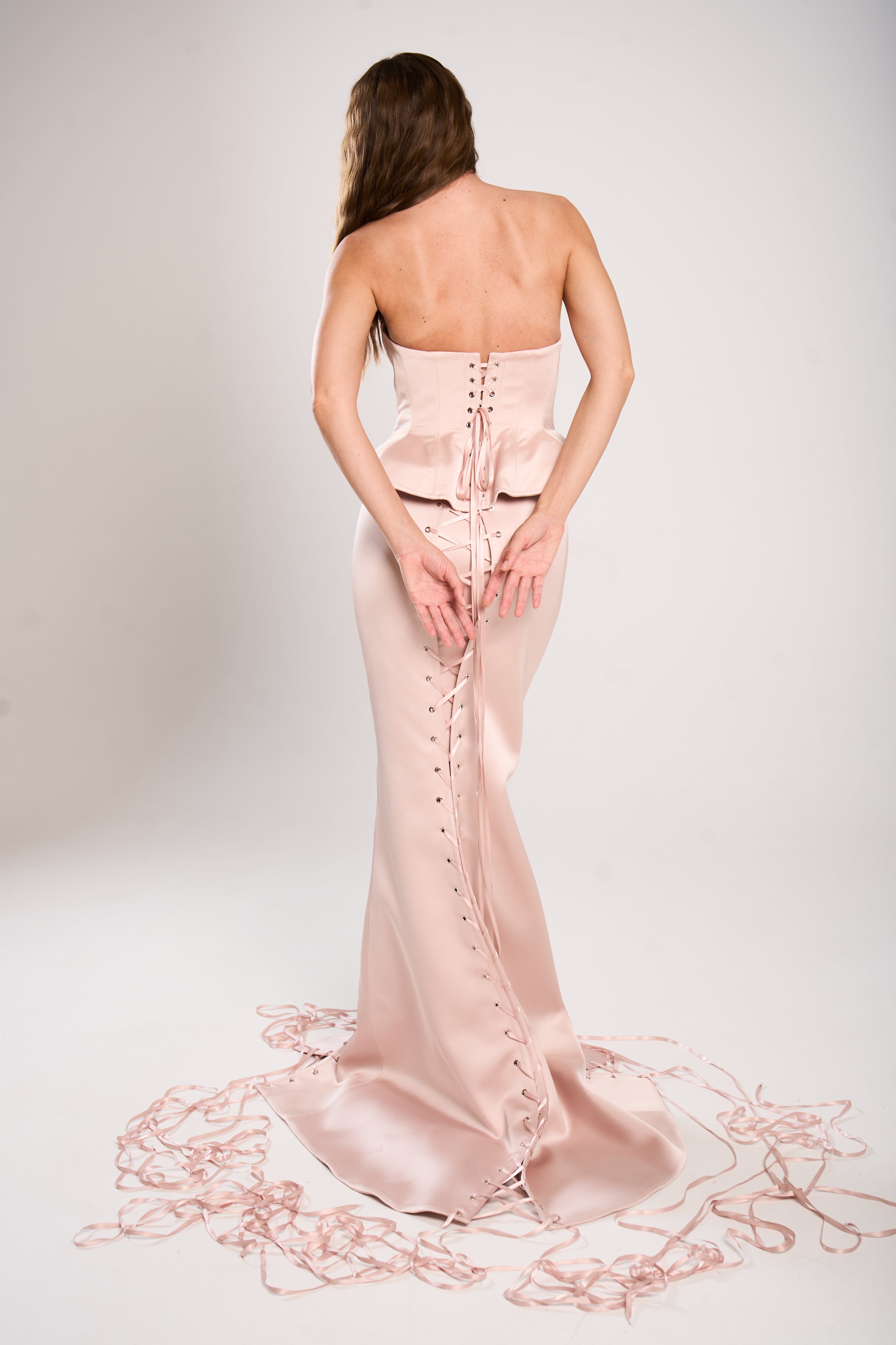 Crafted from powder satin that is dense yet soft and pliable, it sculpts the body beautifully, moves effortlessly, and retains its shape. Refined lacing enhances movement and visually elongates the silhouette.