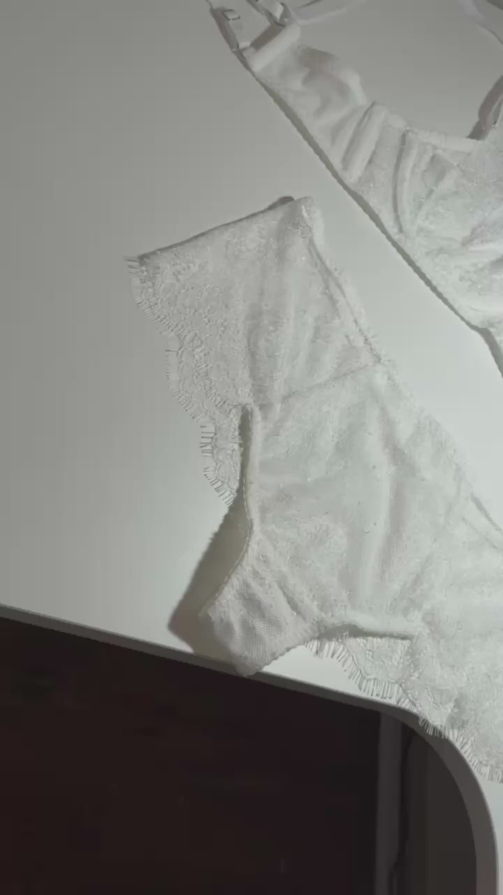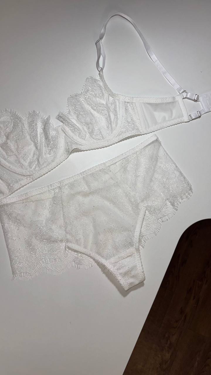 Нижнее белье выполнено из тонкого кружева, которое очень нежно к телу. Бюстгальтер имеет косточку, которая будет красиво поддерживать вашу грудь. Трусики имеют регуляторы, благодаря которым белье будет хорошо сидеть на любом типе фигуры. Также в комплекте идет пояс, который дополнит ваш образ.