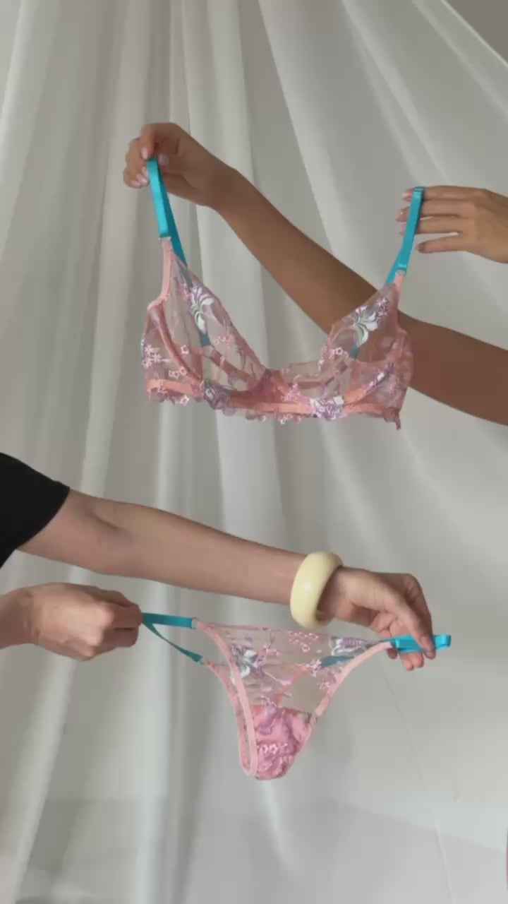 Нижнее белье выполнено из тонкого кружева, которое очень нежно к телу. Бюстгальтер имеет косточку, которая будет красиво поддерживать вашу грудь. Трусики имеют регуляторы, благодаря которым белье будет хорошо сидеть на любом типе фигуры. Также в комплекте идет пояс, который дополнит ваш образ.